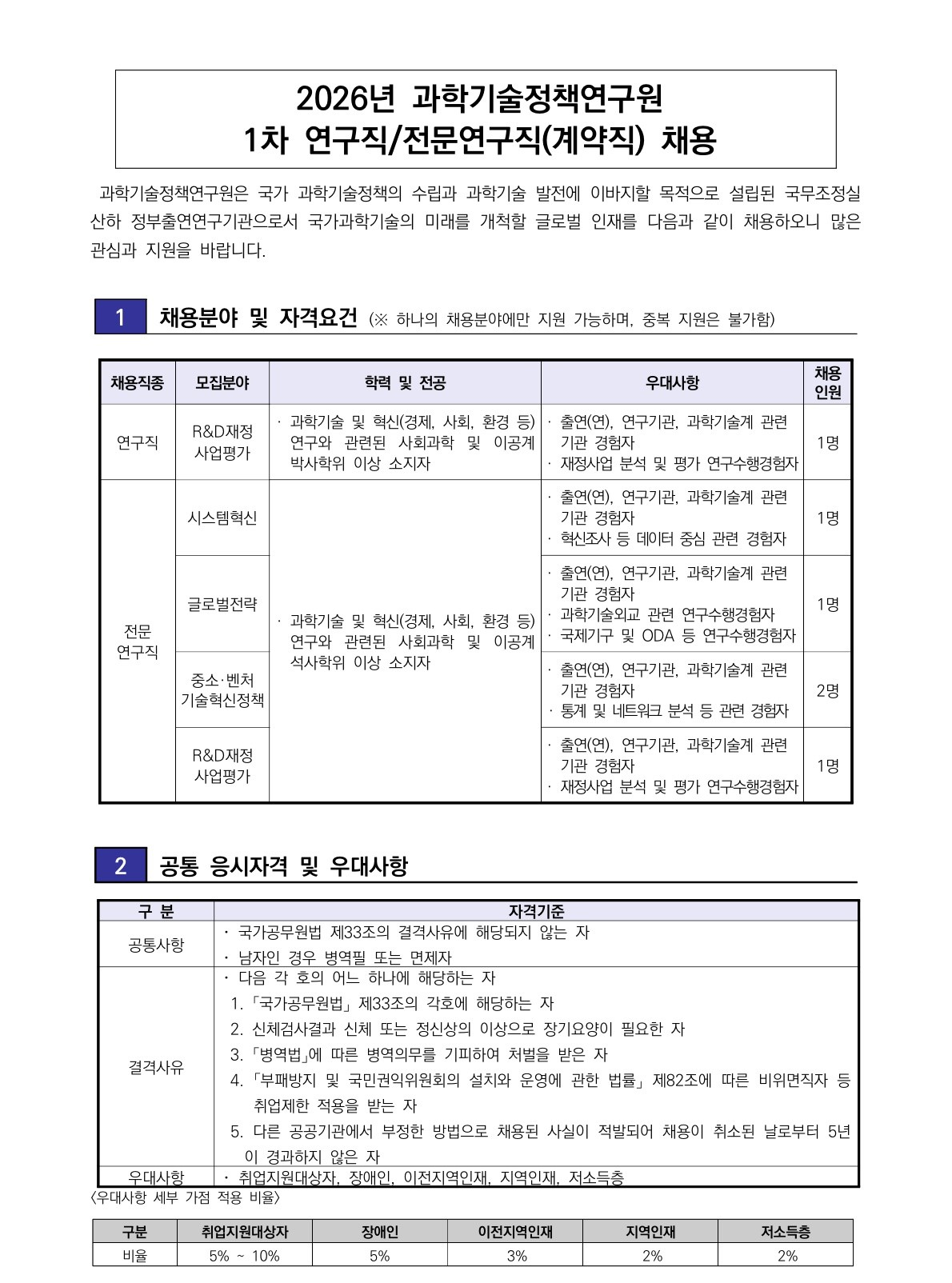 2026년 과학기술정책연구원 1차 연구직/전문연구직(계약직) 채용