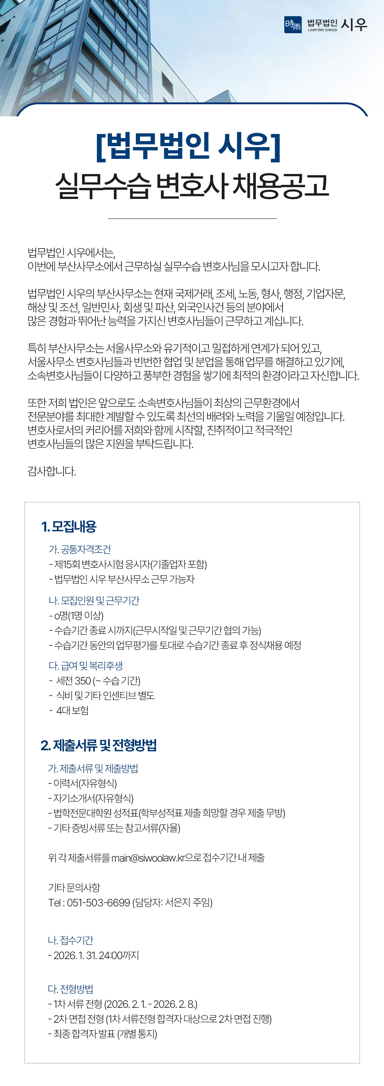 저희 법무법인 시우에서는, 이번에 부산사무소에서 근무하실 실무수습 변호사님을 모시고자 합니다.법무법인 시우의 부산사무소는 현재 국제거래, 조세, 노동, 형사, 행정, 기업자문, 해상 및 조선, 일반민사, 회생 및 파산, 외국인사건 등의 분야에서 많은 경험과 뛰어난 능력을 가지신 변호사님들이 근무하고 계십니다.