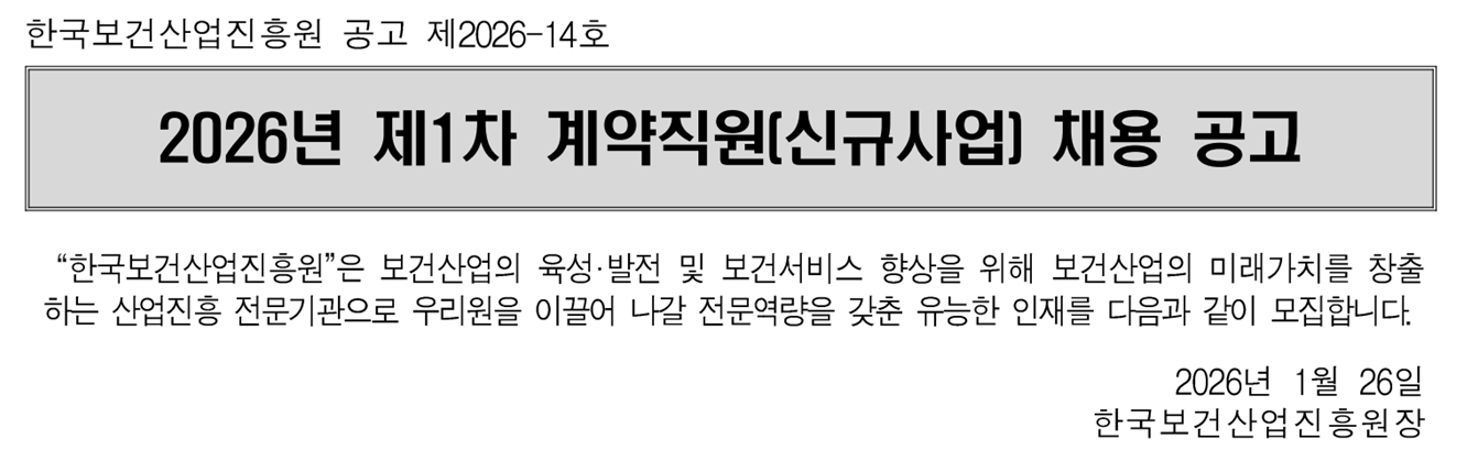 한국보건산업진흥원 2026년 제 차 계약직원 신규사업 채용 공고