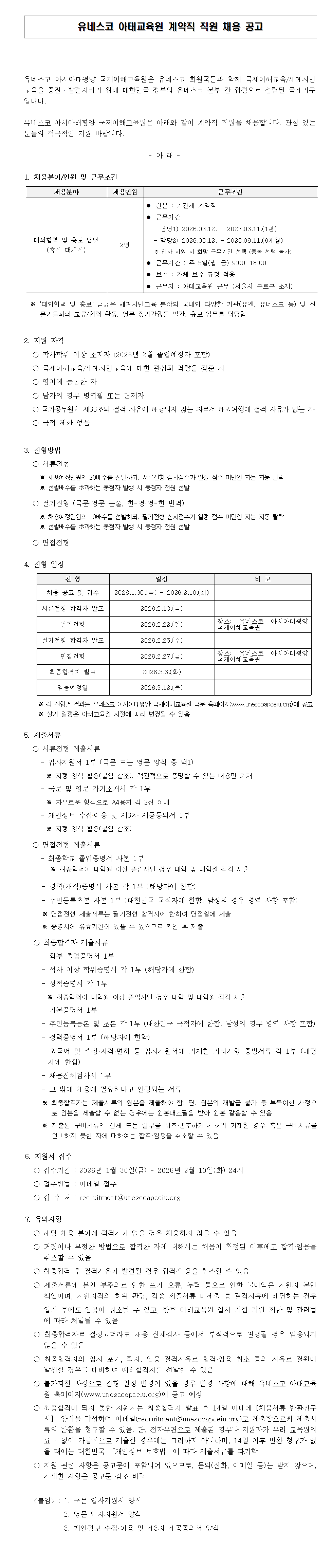 유네스코 아시아태평양 국제이해교육원 계약직 채용 공고 안내