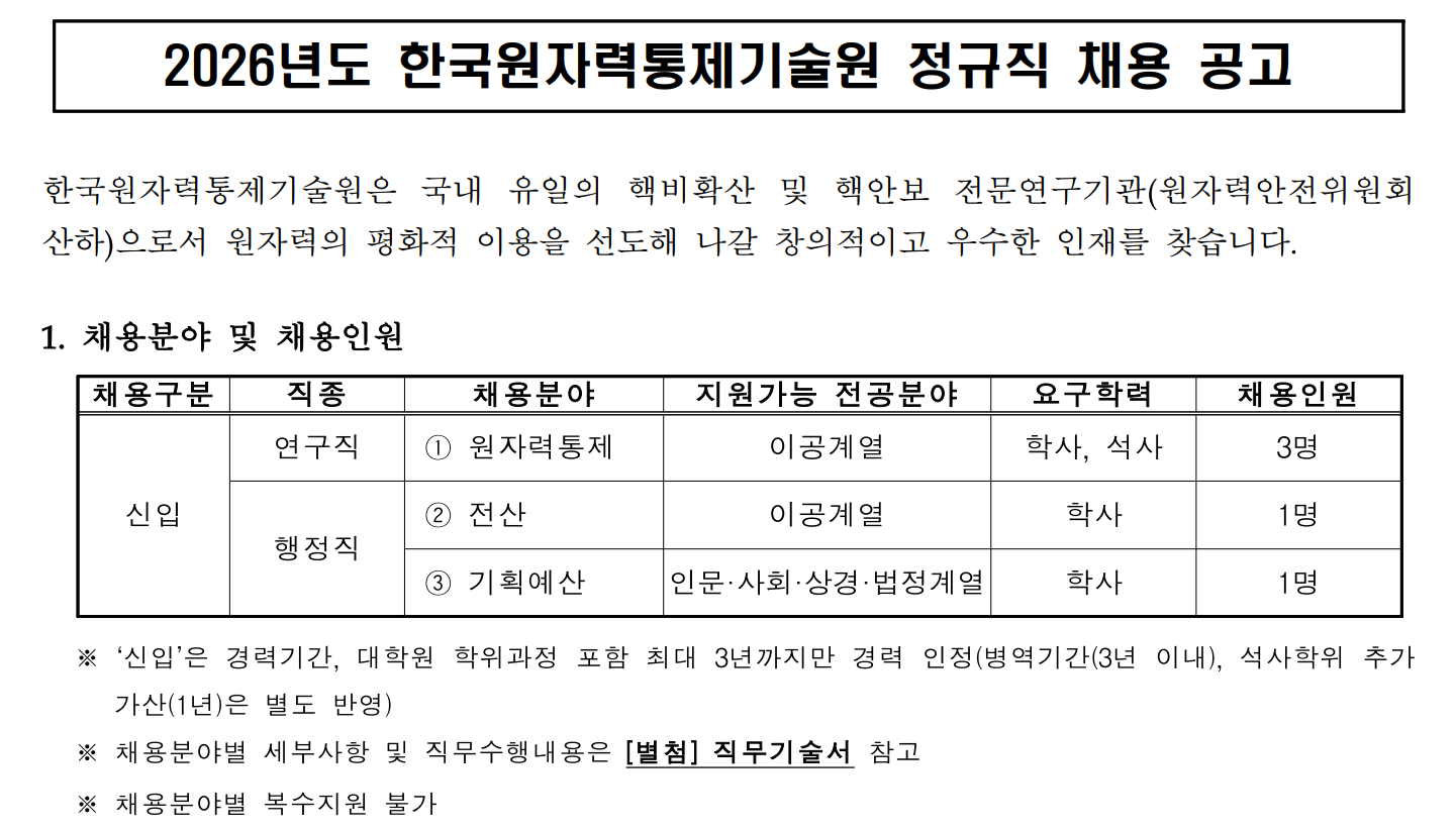 2026년도 한국원자력통제기술원 정규직 채용 공고
