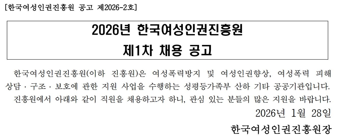2026년 한국여성인권진흥원 제1차 채용 공고