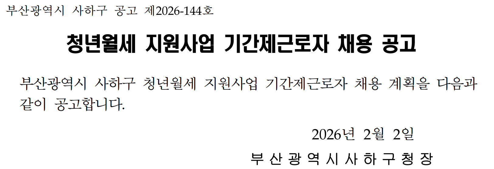부산광역시 사하구 청년월세 지원사업 기간제근로자 채용 공고