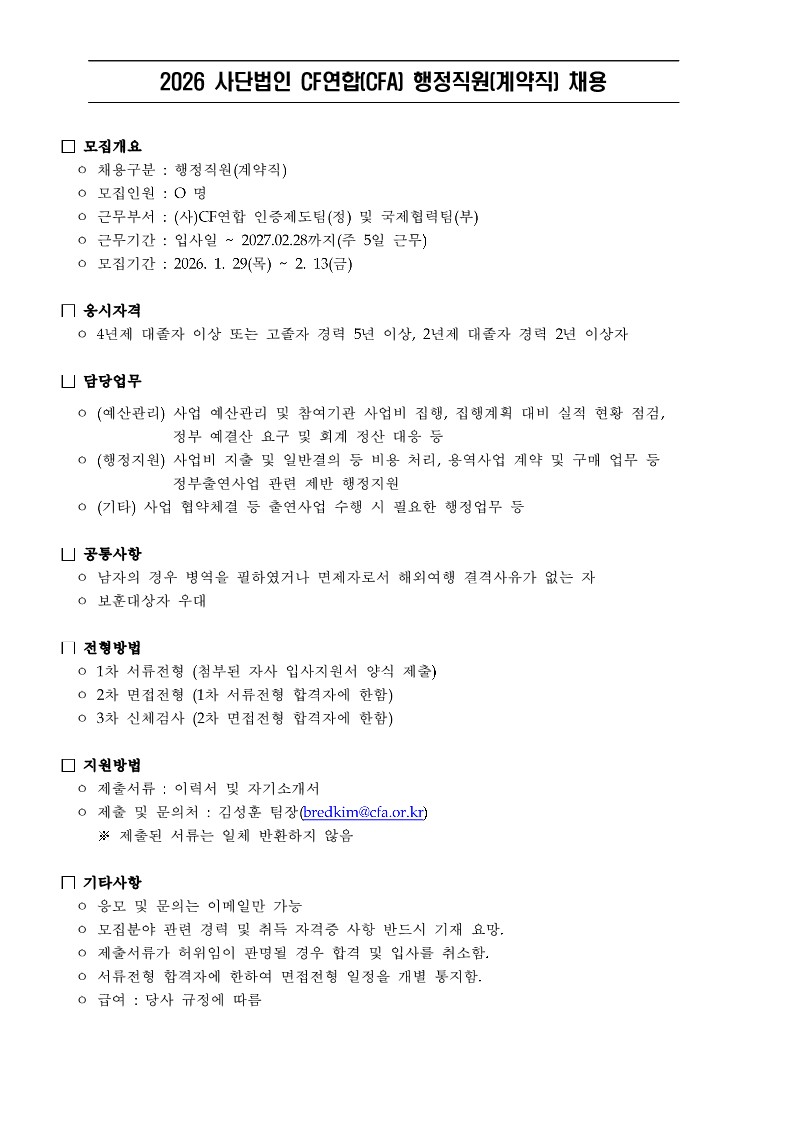 사단법인 CF연합(CFA)행정직원(계약직)채용(~2/13)