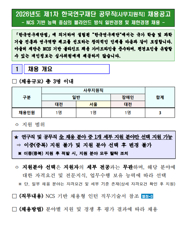 2026년도 제1차 한국연구재단 공무직(사무지원직) 채용공고(~4/1)