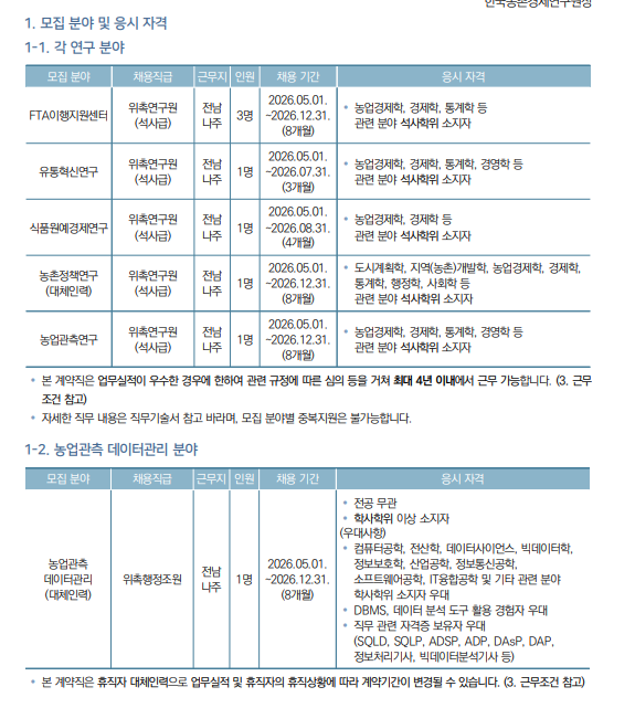 ㆍ식품원예경제연구 / 위촉연구원(석사급) / 1명 / 농업경제학, 경제학 등 관련 분야 석사학위 소지자