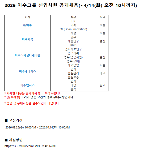 2026 이수그룹 신입사원 공개채용(~4/14(화) 오전 10시까지)