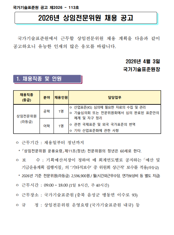 2026년 국가기술표준원 상임전문위원 모집 공고