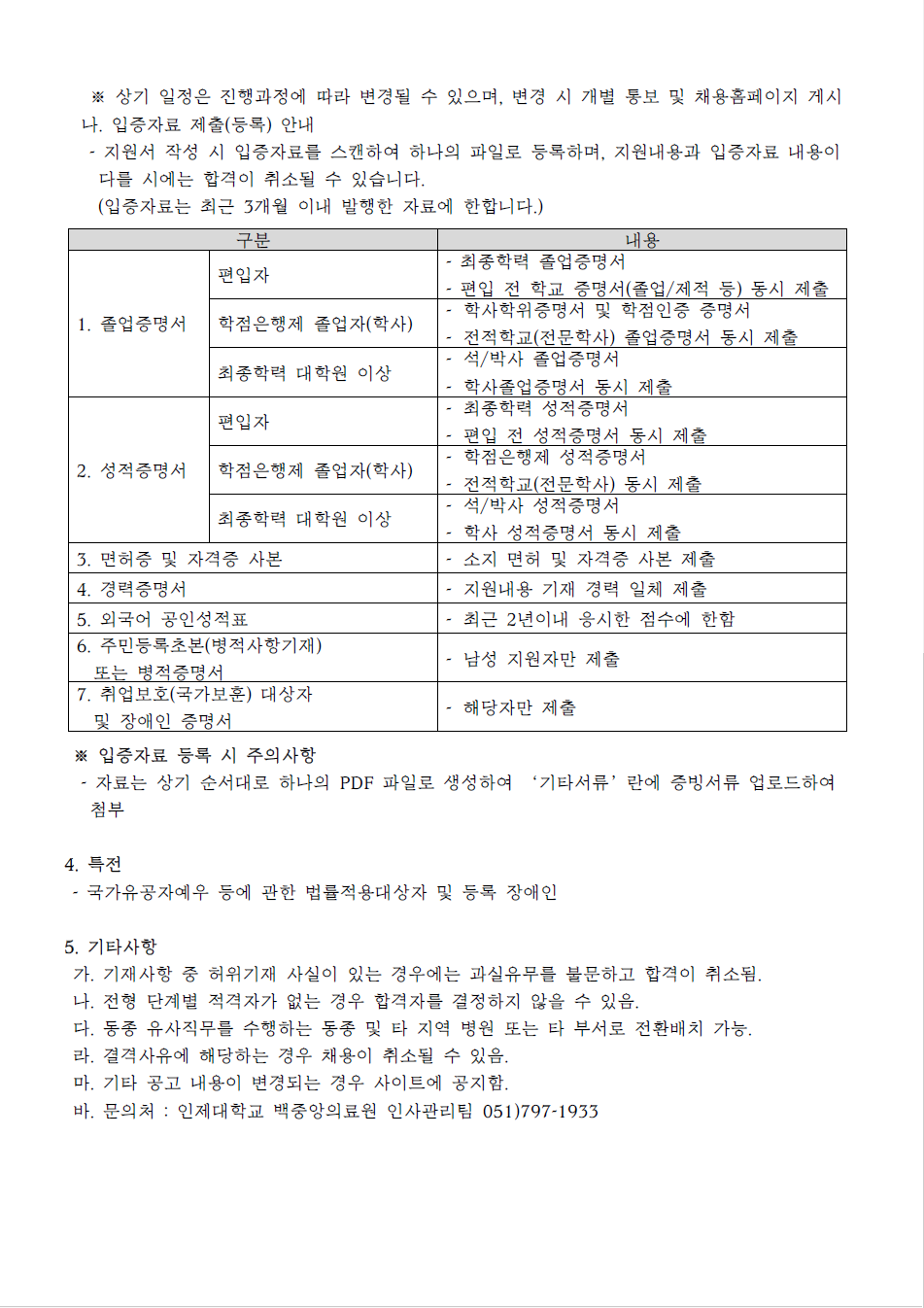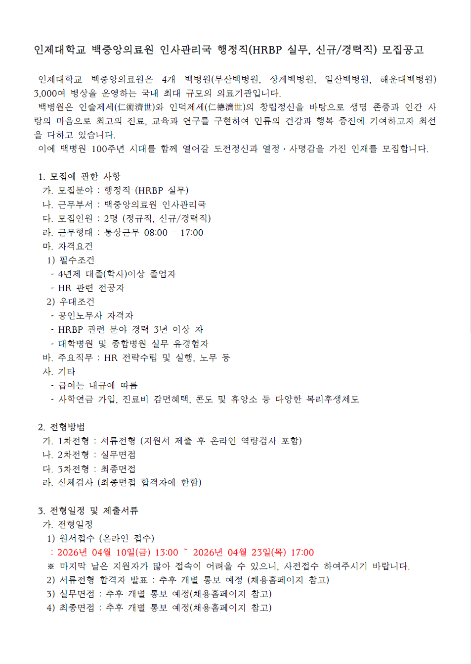 인제대학교 백중앙의료원 인사관리국 행정직(HRBP 실무, 신규/경력직) 채용공고