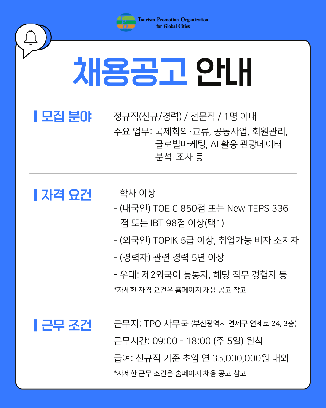 [TPO 사무국] 글로벌도시 관광진흥기구(TPO) 정규직 채용공고