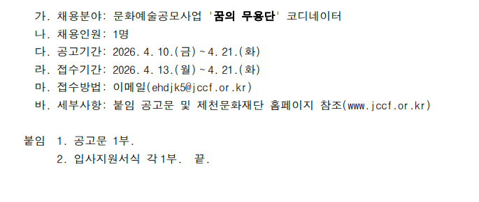 2026년도 (재)제천문화재단 문화예술공모사업 기간제 근로자 채용공고