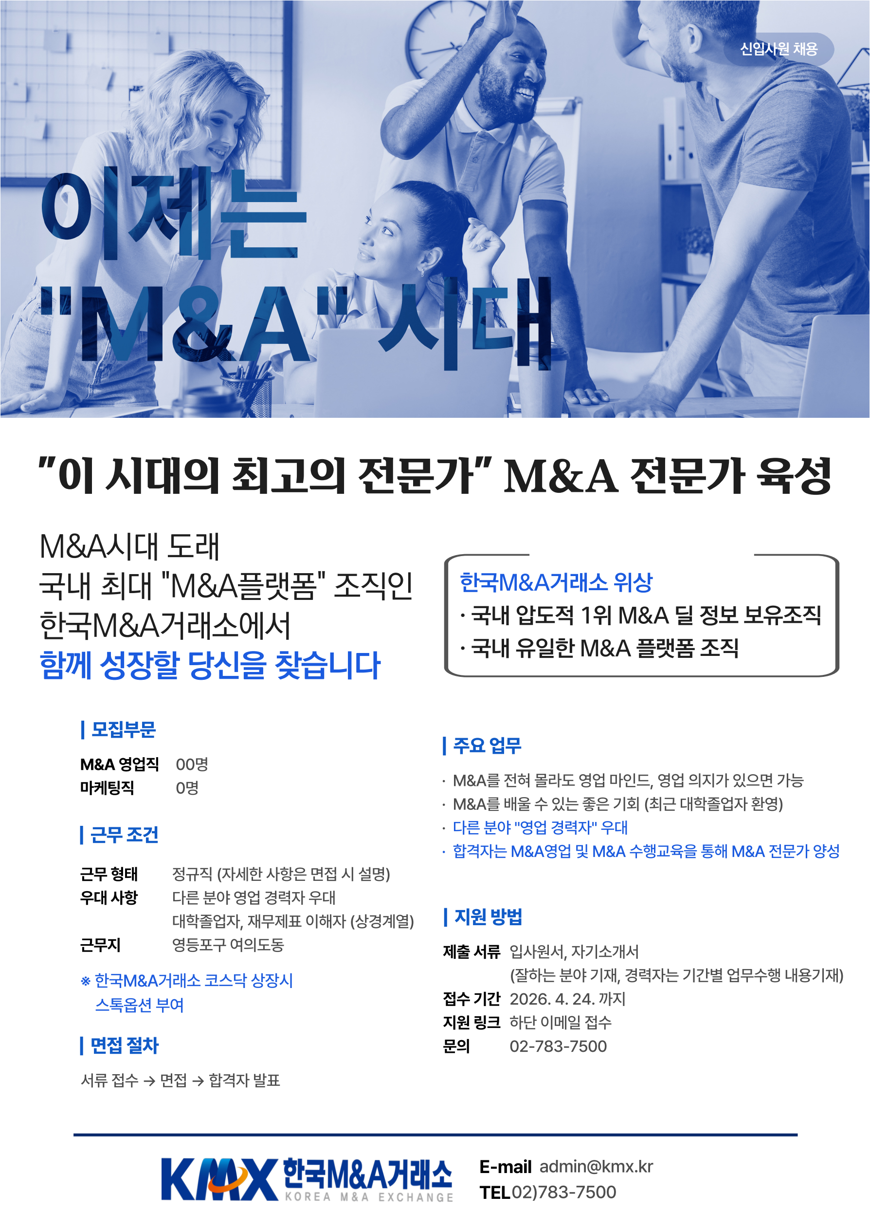[한국M&A거래소㈜] 2026년 각 부문별 채용(~4/24)