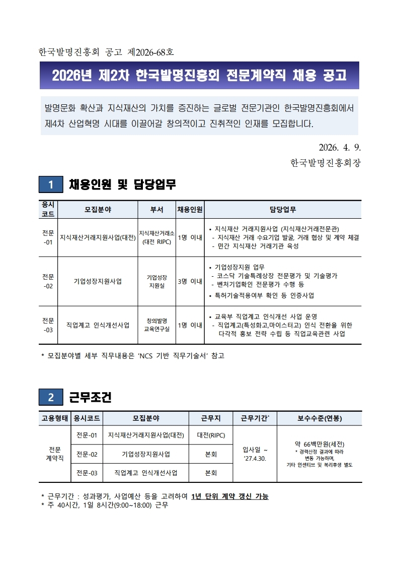 한국발명진흥회 전문계약직 채용공고