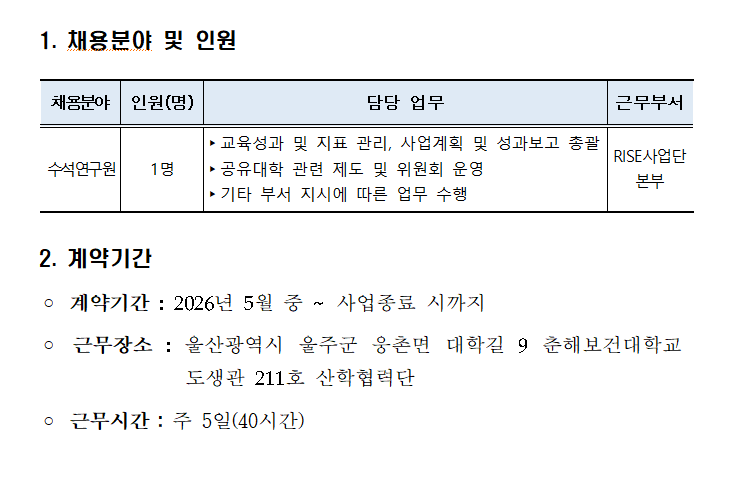 지역혁신중심 대학지원체계(RISE) 사업단 수석연구원 임용 공고